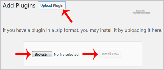 3. Click on €œUpload Plugin€ and then on €œBrowse€. Chose your plugin€™s zip file and then click on €œInstall Now€.