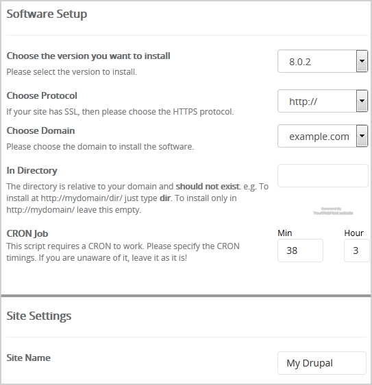 - Admin Username: Your new Drupal username (for security reason do not use the "Administrator" or the "Admin" username.