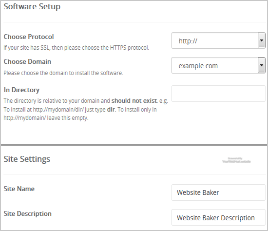 • In Directory: If you want to install this in a directory, for example example.com/directory, enter the directory name. Otherwise, leave this blank to install in your main domain example.com