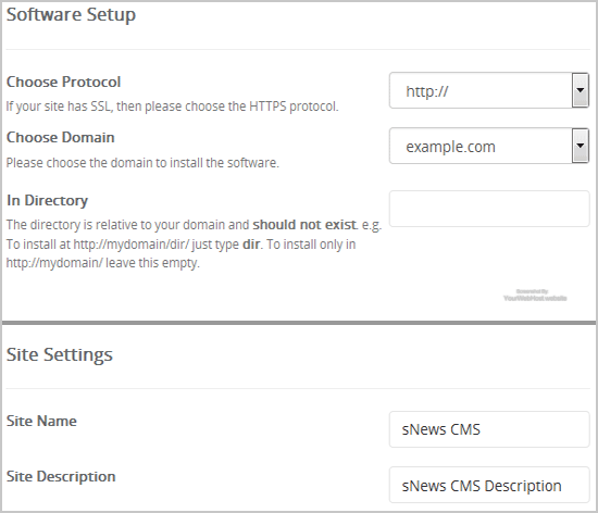 Note: Copy the admin username and password on a notepad because you will need these login details to access the admin area of your sNews Website.