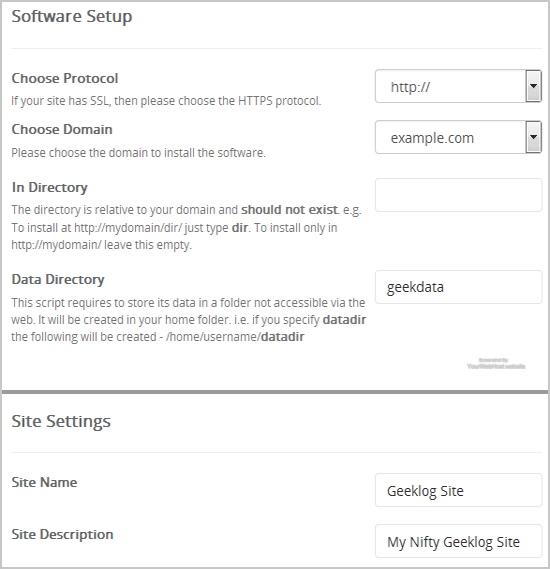 • Site Name: Enter the name of your website, such as "Geeklog".