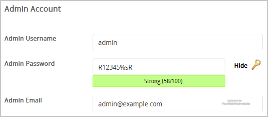 - Admin Username: Your new ProcessWire username (for security reason do not use the "Administrator" or the "Admin" username.)