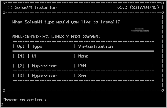 Then it will show you an option to choose virtualization. Most people prefer KVM and others Xen. Select your preferred virtualization by typing 1 or 2 and then press Enter. For KVM, we enter 2 and then hit Enter.